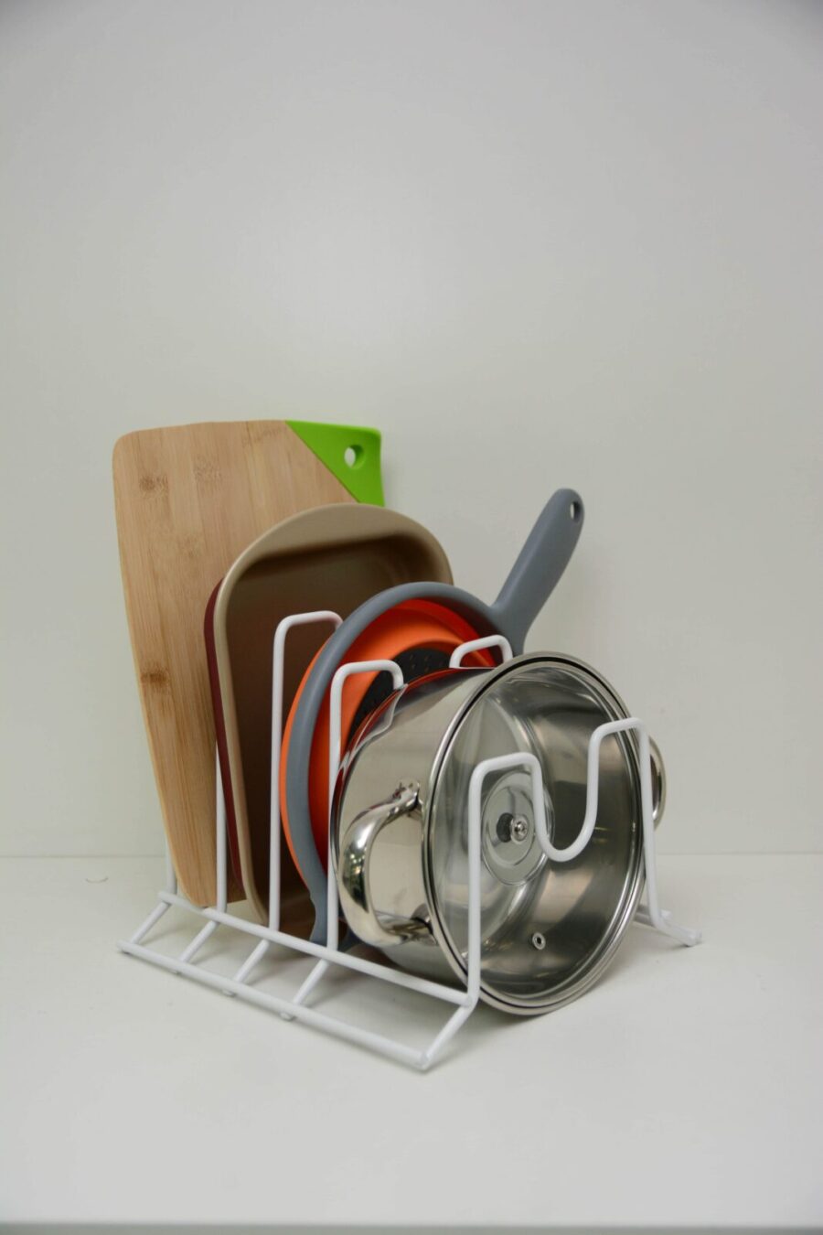 Kit compuesto por dos organizadores de alambre muy resistente para ollas, sartenes, tapas, tablas de picar. Posición horizontal o vertical de acuerdo a la necesidad, para interior de muebles o sobremesada
